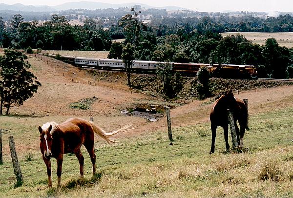 4520 + 4490 on NL71, the NSW Rail Transport Museum Barrington Wilderness Explorer Tour pause at Stroud Road to cross NT26 Daylight XPT from Grafton to Sydney on May 25th, 1997 |