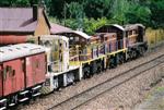 < 48153, 48151, 48157 & 4883 lead an up wheat train past Camberwell Junction, while NR74 on an ARHS ACT tour waits on the branch on June 4th, 1997./td> | 4880 shunts Double Deck Suburban Cars into Goninans at Broadmeadow on June 4th, 1997. |