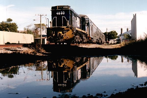 < 48153, 48151, 48157 & 4883 lead an up wheat train past Camberwell Junction, while NR74 on an ARHS ACT tour waits on the branch on June 4th, 1997./td> | 4880 shunts Double Deck Suburban Cars into Goninans at Broadmeadow on June 4th, 1997. |
