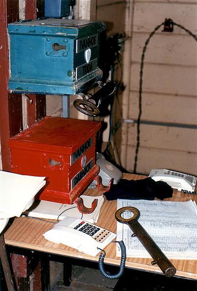 Electric Staff Instrument for the section Manildra - Bumberry. This was one of very few full size electric staff sections in NSW. This section is now in Train Order Territory. Manildra 20th July, 1996 |