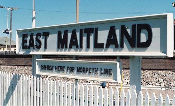 East Maitland was the junction for the Morpeth line. This view is of the sign on the old Morpeth line platform in 1990. |