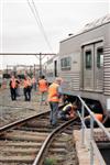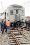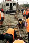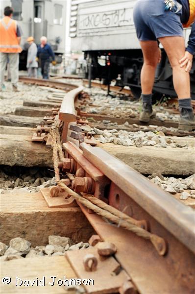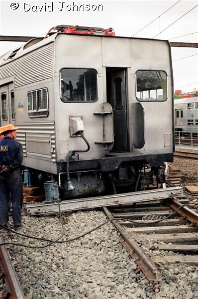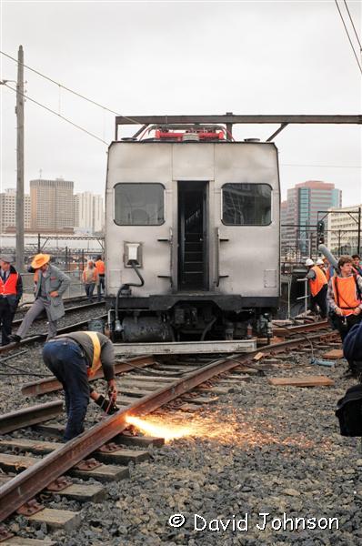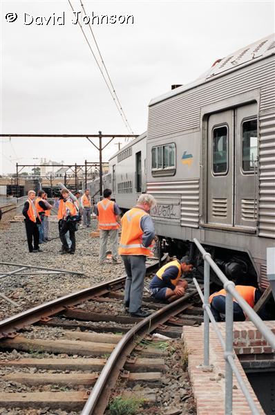 | Work starts on jacking the front car back onto the tracks. |
