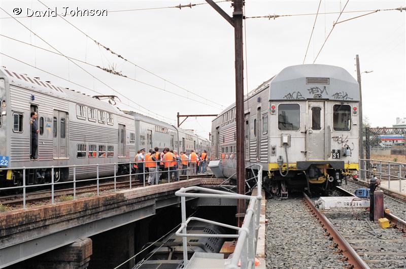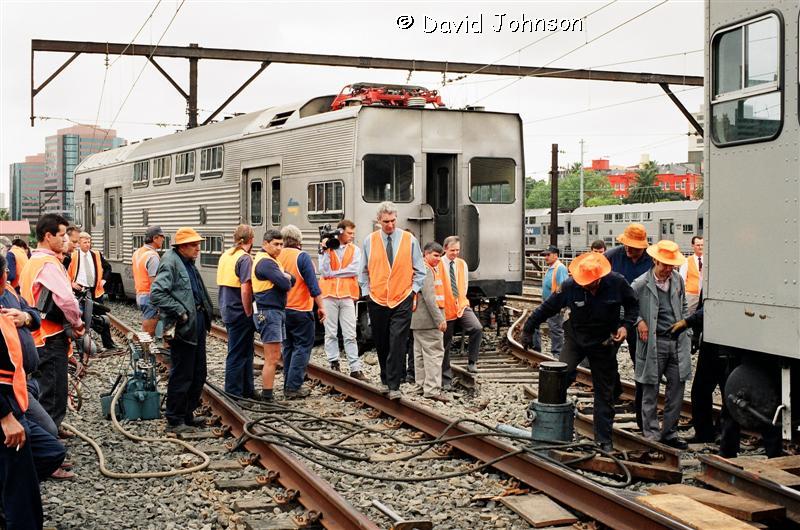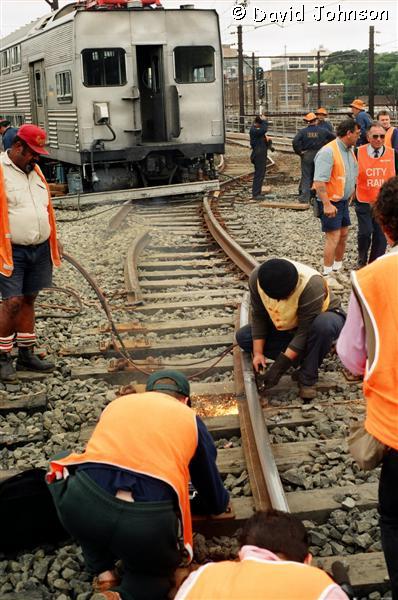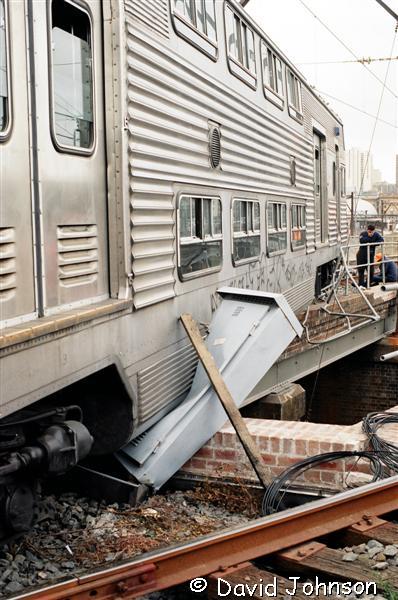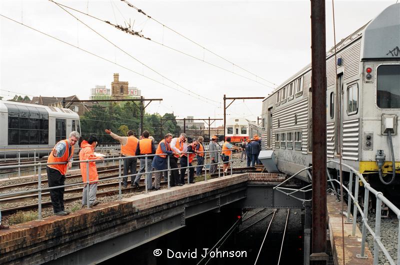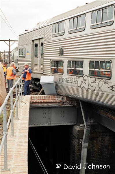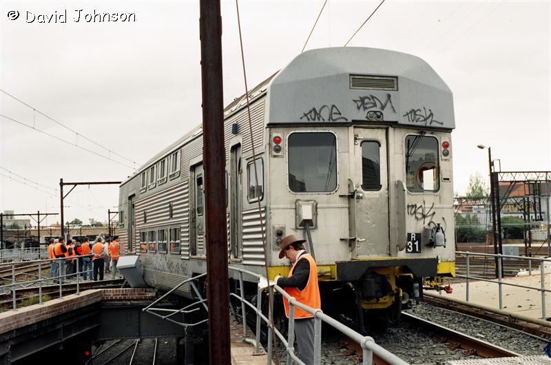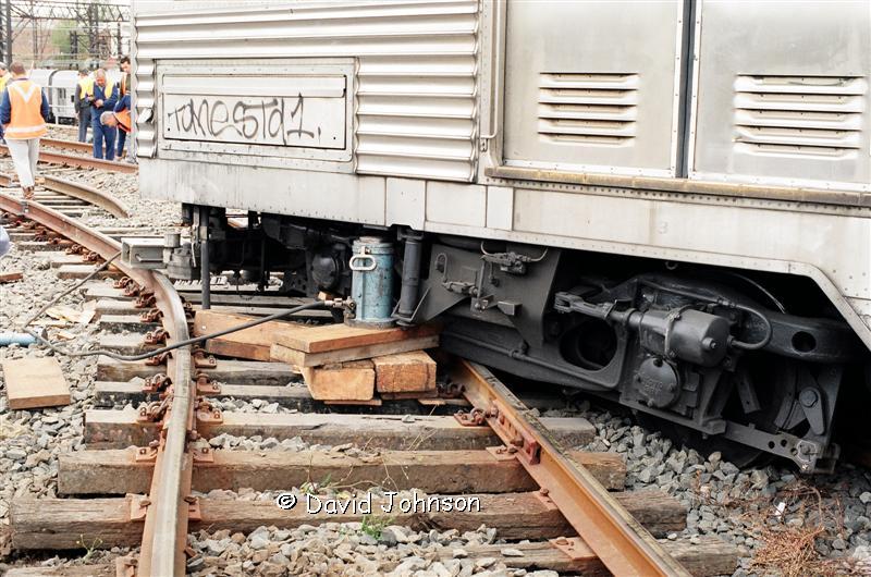 | Early on the morning of December 12th, 1994, six car set R31 was approaching Central on the up suburban line. A set of points which was not correctly locked moved underneath the leading car, causing the No. 1 end to diverge towards the up local line. The train came to a stand precariously over the top of the down suburban line at the flyovers (Flying Junctions). |