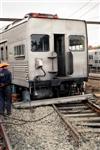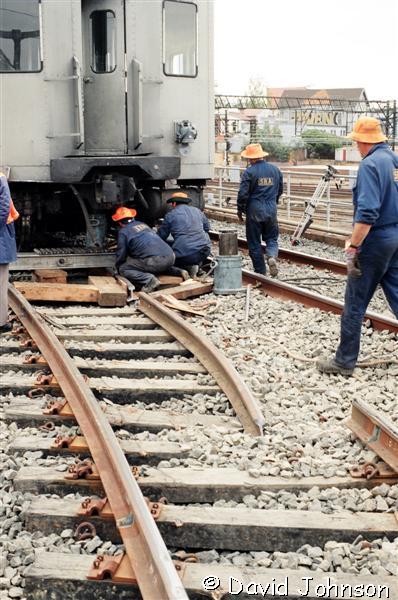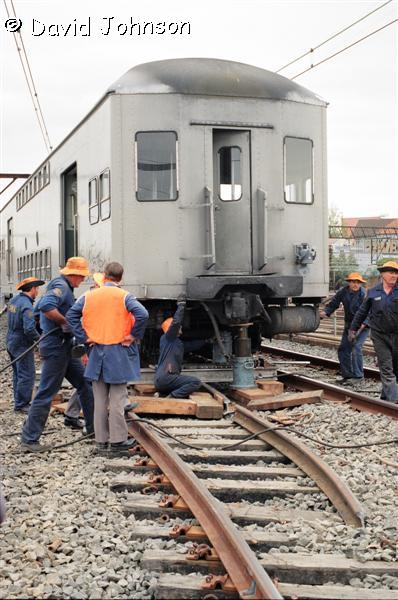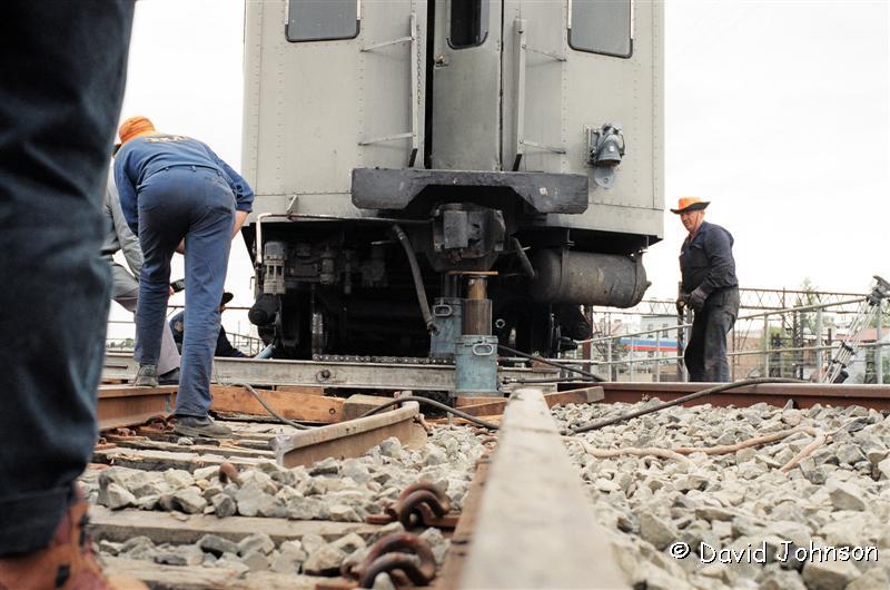 | Jacking the front car back onto the tracks. |