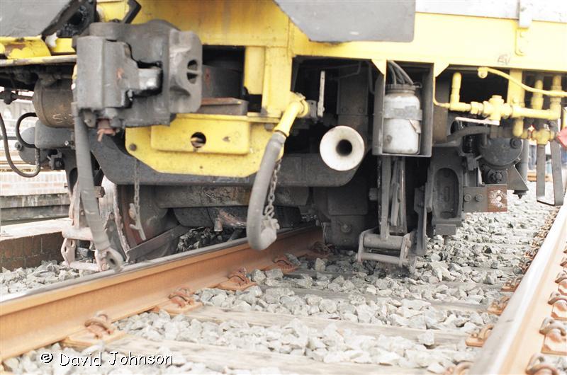 | The front car showing the No. 4 traction motor sitting on the rail head. |