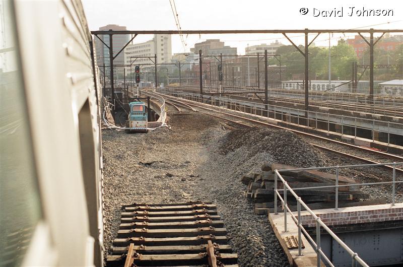 The front car overhanging the down suburban line. |